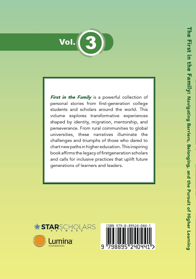 First in the Family brings together powerful narratives of first-generation students who have crossed borders—geographical, cultural, and social—to pursue higher education. Spanning continents and diverse experiences, the chapters explore themes of identity, gender, resilience, and belonging. From navigating privilege and overcoming shame to embracing agency and transforming lives through education, these stories reveal both the struggles and triumphs of being “first.” Each chapter offers a testament to courage, perseverance, and the transformative power of learning to uplift families and communities. Inspiring and deeply human, this volume serves as a vital resource for students, educators, and policymakers committed to expanding access and equity in education worldwide.